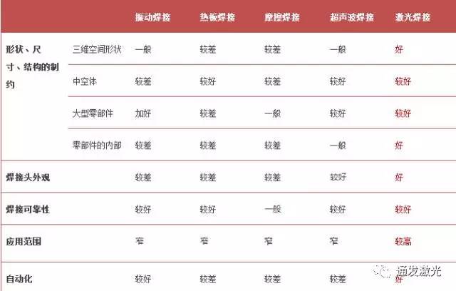 除了以上四種是主要的塑料焊接方法,目前還有一種新型的焊接方式——塑料激光焊接,下面我們先來看與傳統焊接技術相比,塑料激光焊接到底有哪些突出的地方?如下表