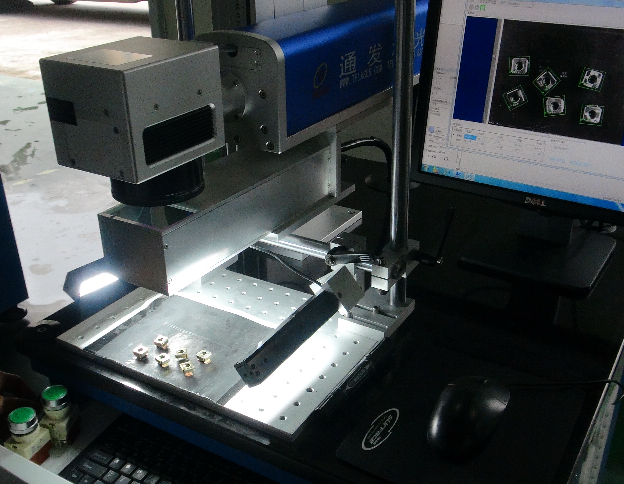 現在新技術不斷涌現,通發激光最近新研制的視覺定位激光打標機,可實現產品只要在激光打標掃描振鏡的加工范圍內,即可實現準確打標,即每次的位置即使不一樣,加工位置也沒有問題。本技術運用了視覺定位原理,先對產品進行模板制定,確定產品的外形,保存為標準模板,在正常加工時對所需加工的產品進行拍照,由計算機進行快對比模板進行對比及位置定位,調整后即可對產品進行準確加工。所加工的產品外形可以是圓形、方形、非規則形狀都可以識別,這種工藝特別適合小產品,可免除定位料盤、固定夾具的加工,大大節省了激光打標加工周期。同時也適合流水線產品移動時,進行的在線激光打標加工。