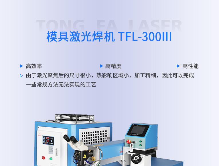 通發(fā)激光TFL-300Ⅲ大功率模具激光焊機,比普通激光焊機修復(fù)模具效率快1.5-2倍,適合0.3-0.6激光焊絲,大功率更適合修復(fù)鈹銅模具、鋁模等較難修復(fù)的模具。