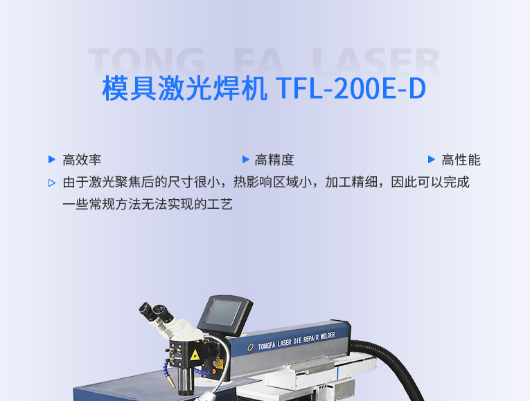 出口型模具激光焊機是通發激光公司專門為出口國外客戶使用而設計的系列機型TFL-200E-D,配置激光頭電動升降,同時配置操縱桿無極調速控制XY橫向和縱向電動移動。適用于各類精密注塑模具、壓鑄模具等模具激光修補焊接;同時也適合鑄件沙孔激光修補、模具崩缺激光修復、過切加工等的激光修補;各類金屬結構件、金銀首飾的激光焊接加工。